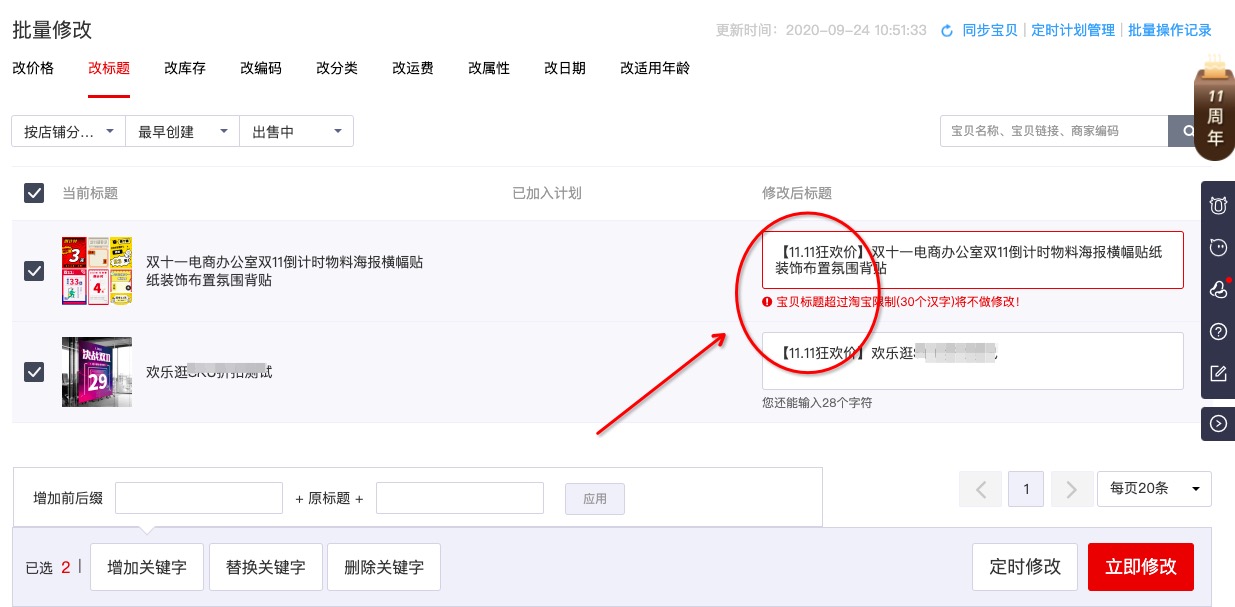 新增活动关键词:双十一特价、双十一促销、11.11狂欢节等,可以将关键词布局到商品标题中,增加商品的节日气氛同时更利于获到官方流量。店铺商品可以直接使用欢乐逛,批量修改标题。